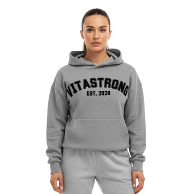La College Hoodie Grey unisce comfort, volume e stile. Una felpa unisex dal fit oversize, pensata per chi vive lo spirito Vitastrong anche fuori dalla palestra.