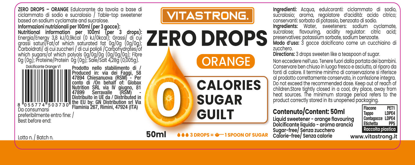 Zero Drops Orange è un dolcificante liquido aromatizzato all’arancia, studiato per sostituire completamente lo zucchero tradizionale senza apportare calorie, zuccheri o grassi.
