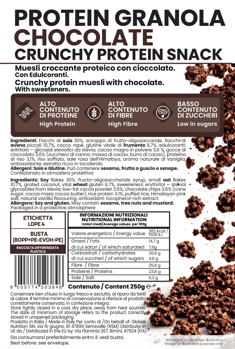 Protein Granola Chocolate di Vitastrong è il muesli proteico croccante perfetto per chi vuole iniziare la giornata con gusto, energia e un elevato apporto nutrizionale. Una miscela bilanciata di fiocchi di soia, avena, proteine e cioccolato fondente, pensata per offrire una colazione o uno snack sano, saziante e ricco di proteine.