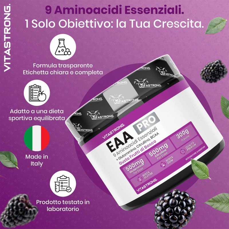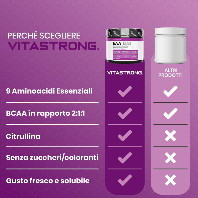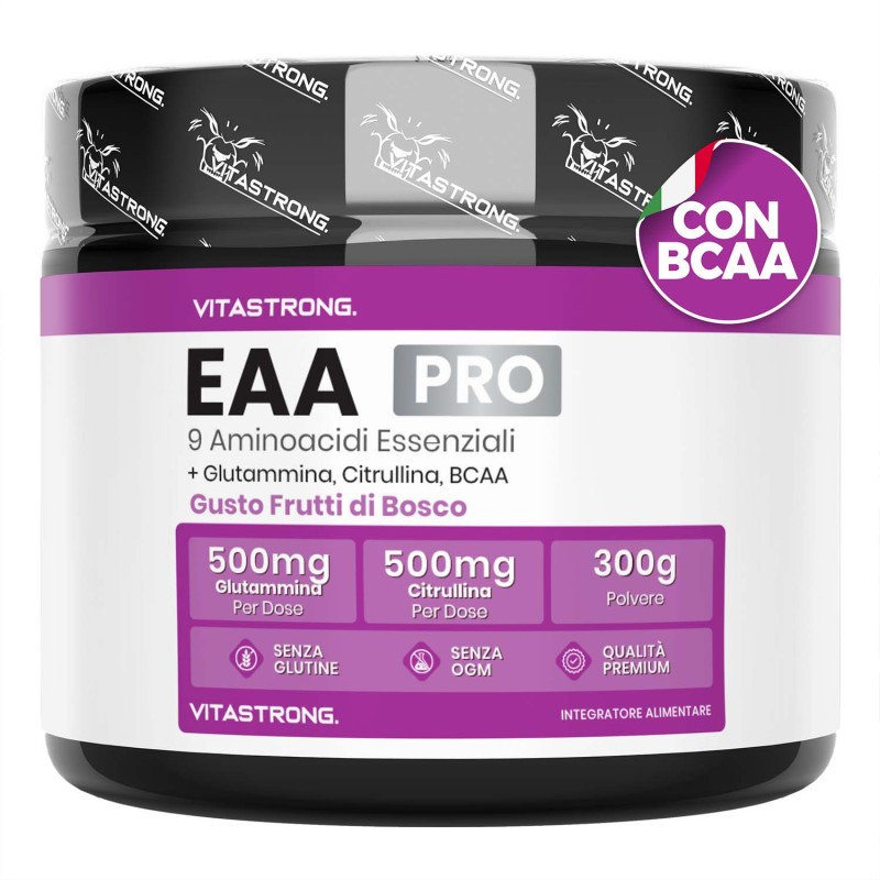 Vitastrong EAA Pro è un integratore avanzato di aminoacidi essenziali al gusto di Limone, Pesca o Frutti Rossi specificamente formulato per soddisfare il fabbisogno proteico/azotato con conseguenti effetti sul recupero muscolare, la crescita e le prestazioni fisiche. Gli aminoacidi essenziali (EAA) sono componenti fondamentali delle proteine e il nostro corpo non può produrli autonomamente, rendendone indispensabile l’assunzione tramite dieta o integrazione.