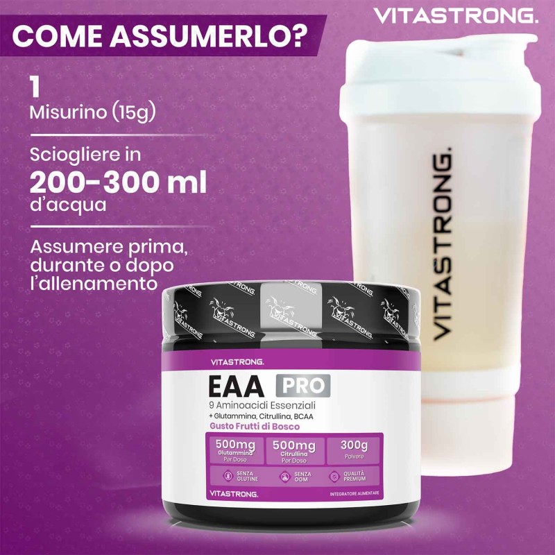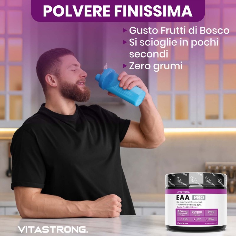 Vitastrong EAA Pro supporta il corpo in diverse fasi dell’allenamento, dalla resistenza durante lo sforzo al recupero successivo. Gli aminoacidi essenziali sono fondamentali per la sintesi proteica, un processo che ripara e costruisce i muscoli dopo l’attività fisica intensa.