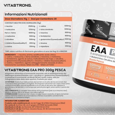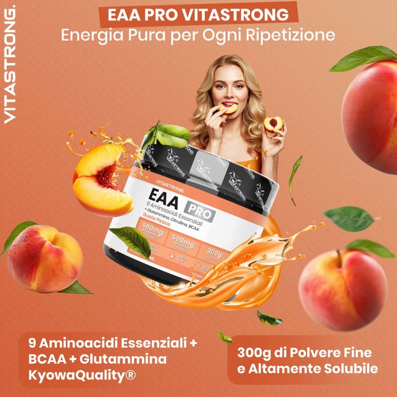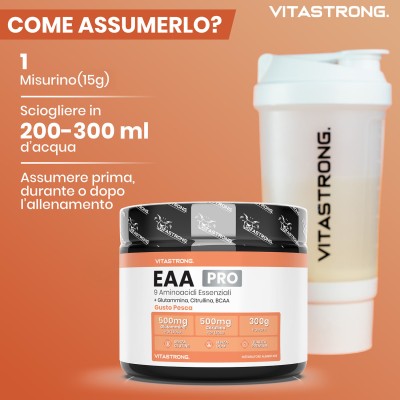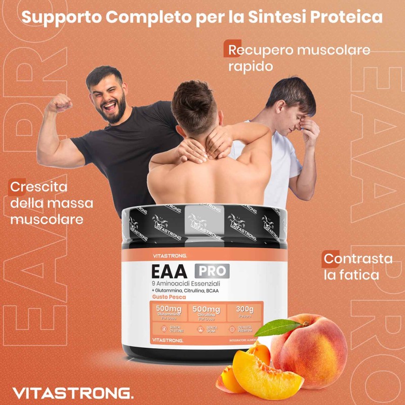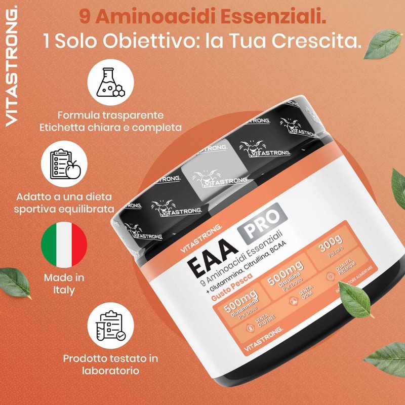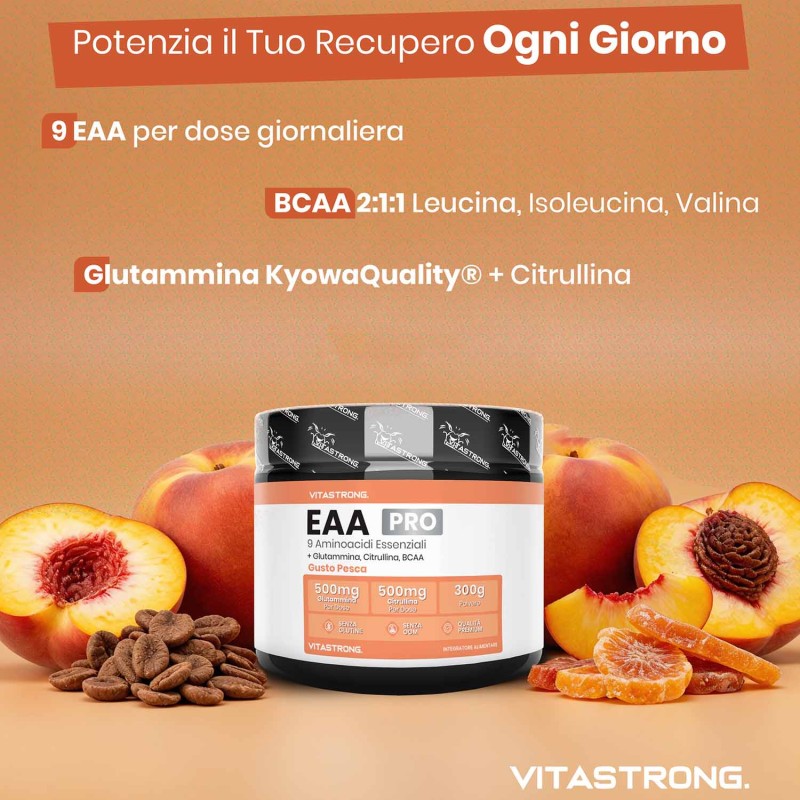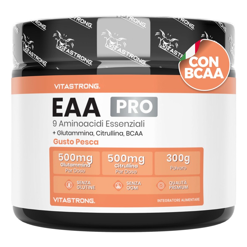 Vitastrong EAA Pro è un integratore avanzato di aminoacidi essenziali al gusto di Limone, Pesca o Frutti Rossi specificamente formulato per soddisfare il fabbisogno proteico/azotato con conseguenti effetti sul recupero muscolare, la crescita e le prestazioni fisiche. Gli aminoacidi essenziali (EAA) sono componenti fondamentali delle proteine e il nostro corpo non può produrli autonomamente, rendendone indispensabile l’assunzione tramite dieta o integrazione.