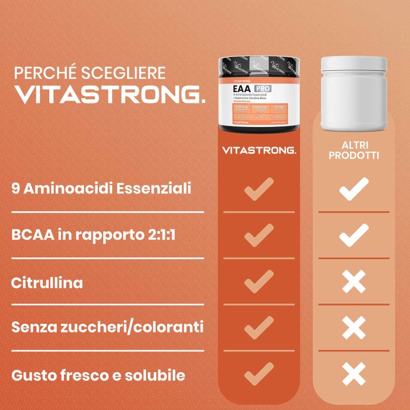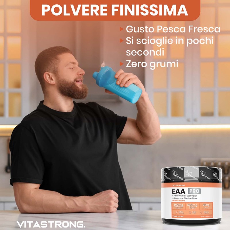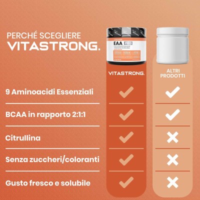 Vitastrong EAA Pro è ideale per chi pratica sport intensi e cerca un prodotto completo per ottimizzare le prestazioni. Perfetto per atleti, bodybuilder o chiunque voglia favorire la crescita muscolare e migliorare il recupero post-allenamento.