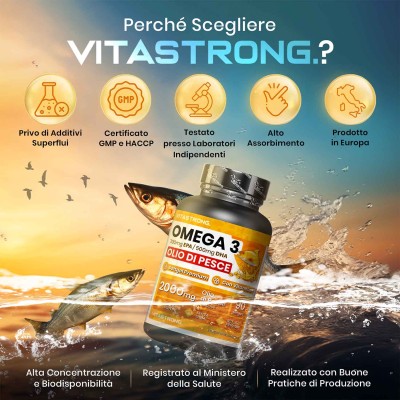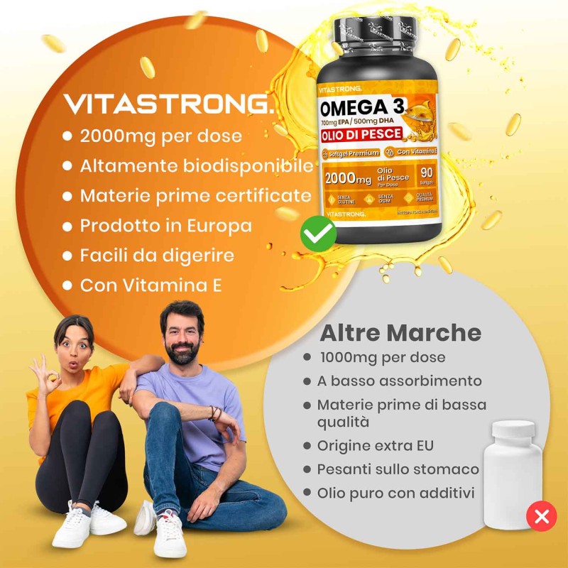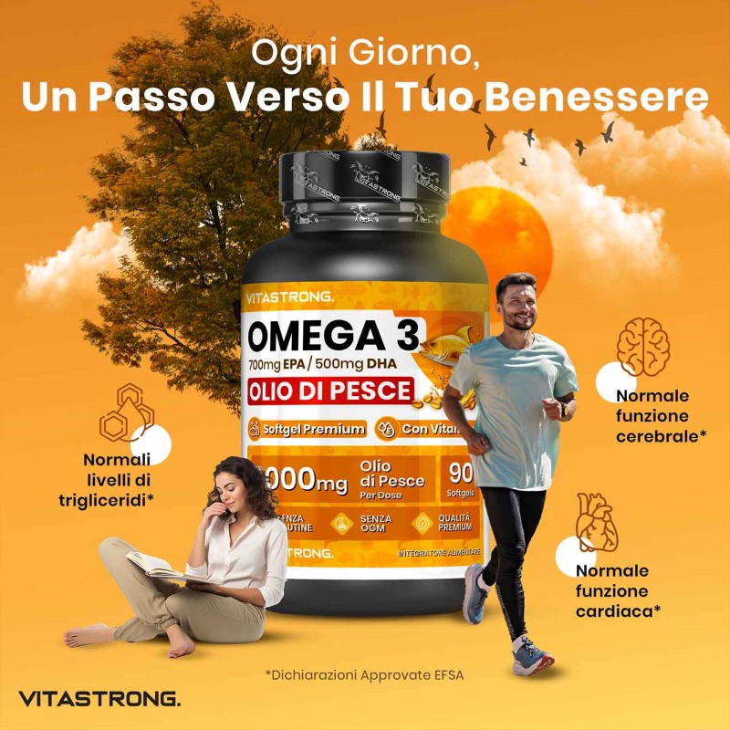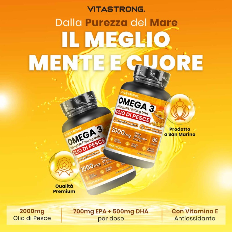 I’omega 3 di Vitastrong è un integratore alimentare di altissima qualità, formulato con olio di pesce ad alta concentrazione di EPA e DHA. Questi acidi grassi essenziali supportano il normale funzionamento del cuore, del cervello e della vista, fornendo un apporto ottimale per il tuo benessere quotidiano.
