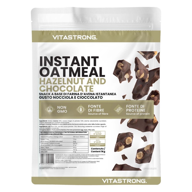 Farina D’avena istantanea di Vitastrong, gusto Nocciola & Cioccolato: un abbraccio di sapori autentici e di nutrizione equilibrata. Alto contenuto di fibre e proteine, con il piacere del cioccolato e la ricchezza della nocciola. Energia pulita e gusto puro!