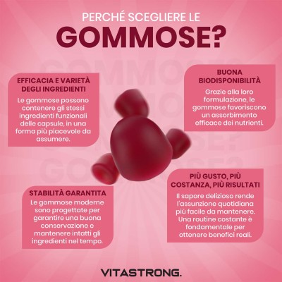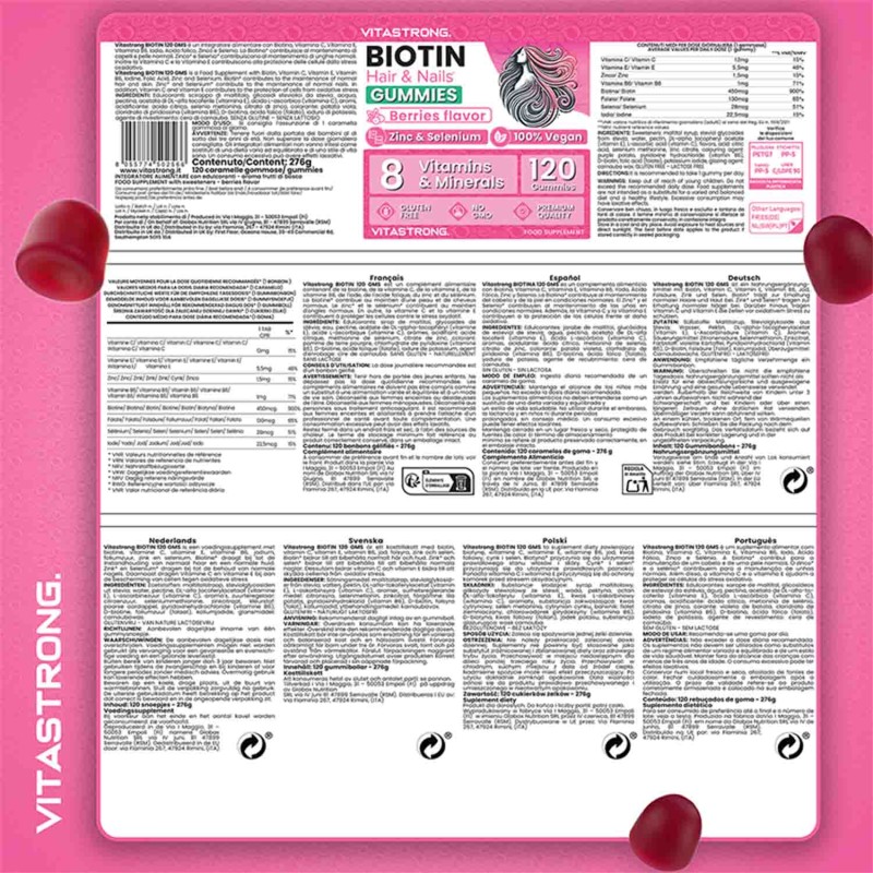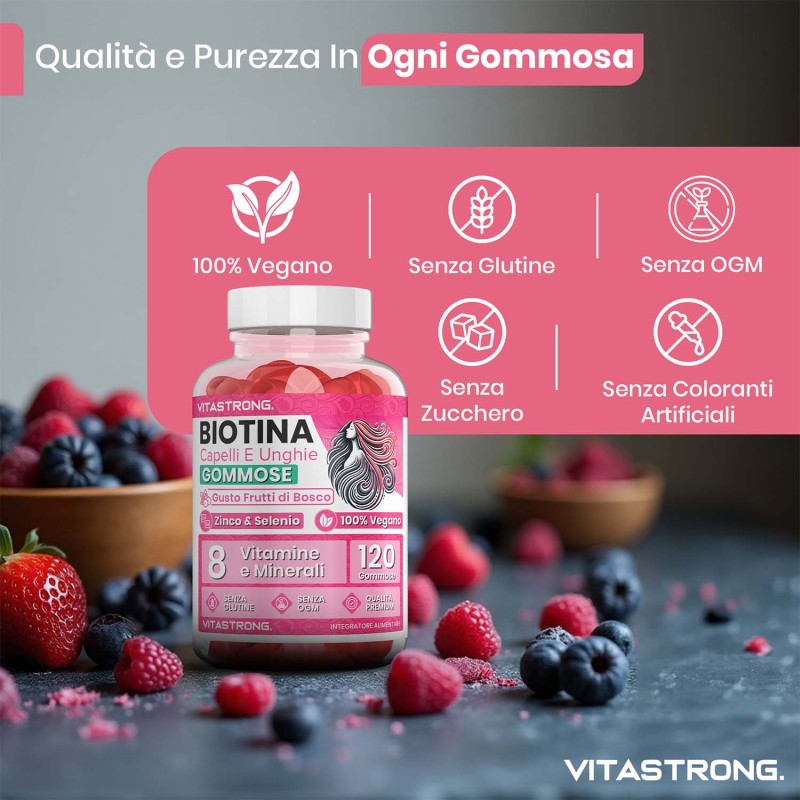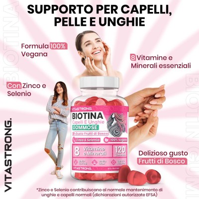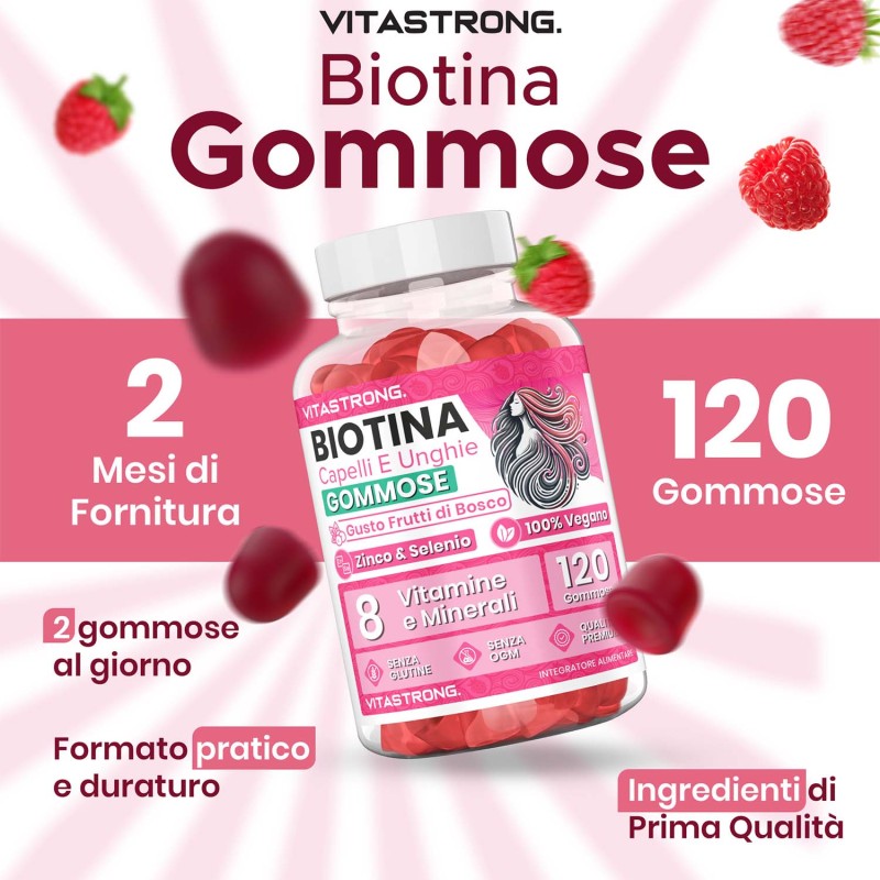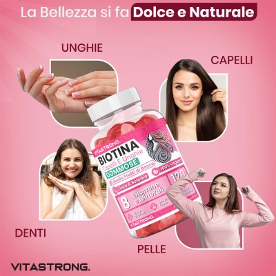 Vitastrong Biotina Gommose è un integratore alimentare in formato caramella gommosa, creato per sostenere la salute di capelli e unghie in modo pratico e piacevole. La formula contiene Biotina ad alto dosaggio, insieme a un complesso di vitamine e minerali studiati per agire sinergicamente: Zinco, Selenio, Vitamina C, E, D, B6, Acido Folico e Iodio.