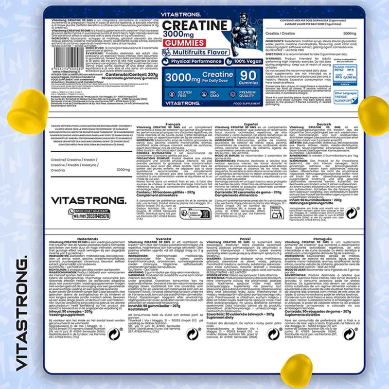 La nuova versione della Creatina Vitastrong in caramelle gommose è un integratore innovativo pensato per chi cerca prestazioni fisiche elevate ma vuole dire addio a polveri e misurini. Ogni dose (3 caramelle) fornisce 3000 mg di creatina, il dosaggio ideale per migliorare la forza, l’esplosività e la resistenza in esercizi brevi e intensi.