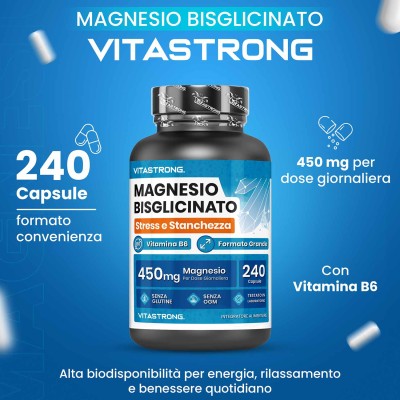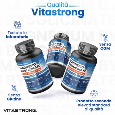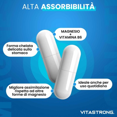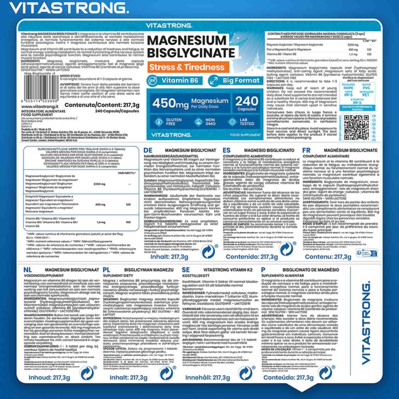 Ingredienti: Magnesio bisglicinato; involucro capsula (idrossipropil metilcellulosa); agente antiagglomerante: sali di magnesio degli acidi grassi; agente di carica: cellulosa; Vitamina B6 (cloridrato di piridossina). SENZA GLUTINE – SENZA LATTOSIO
