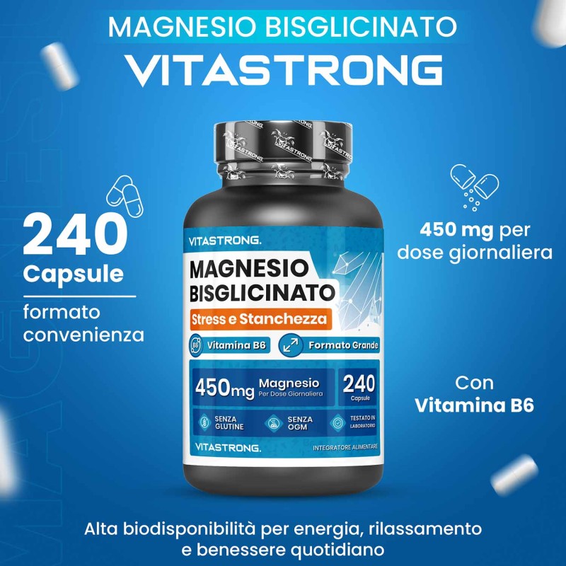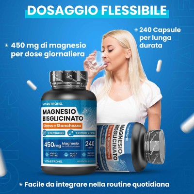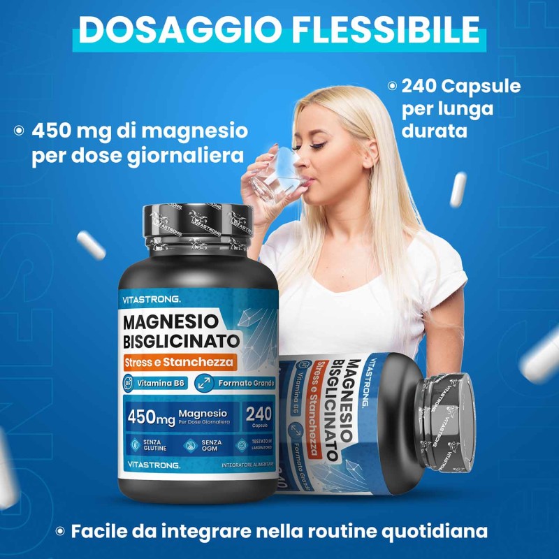 La nostra formula fornisce 450 mg di magnesio bisglicinato al giorno, un dosaggio mirato per aiutarti a ritrovare vitalità, concentrazione e benessere generale.