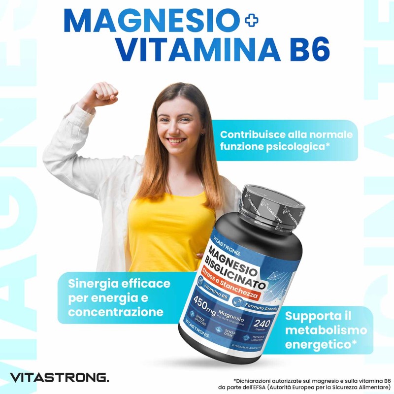 La presenza di vitamina B6 ne potenzia ulteriormente l’efficacia, migliorando il metabolismo energetico e la normale funzione psicologica.