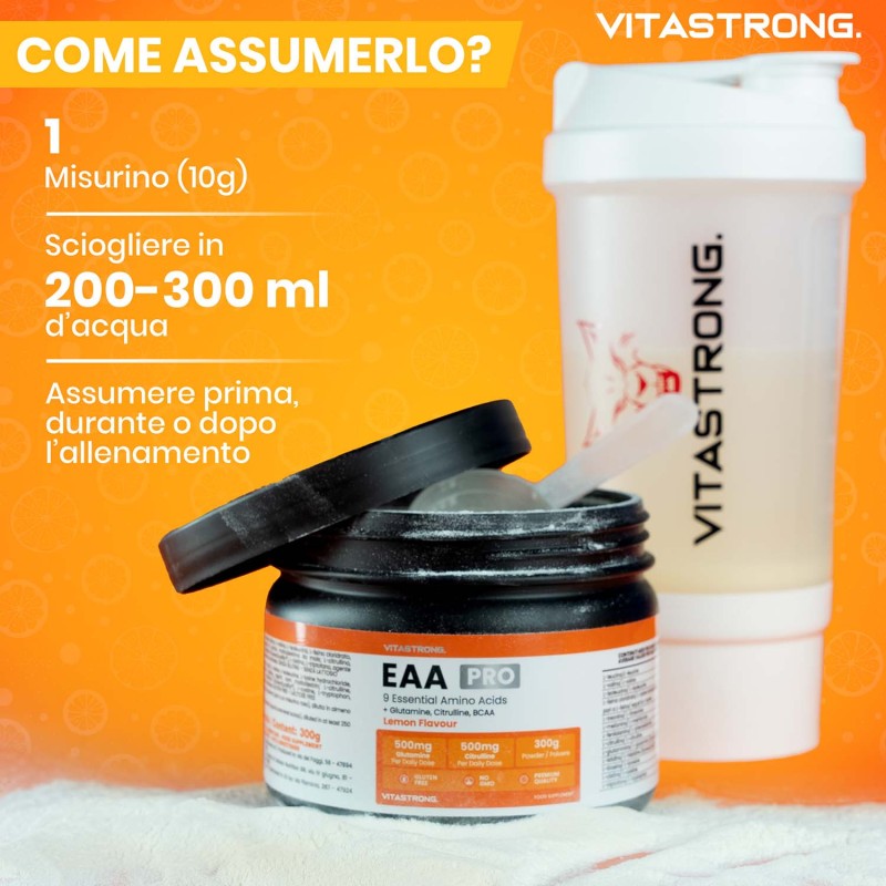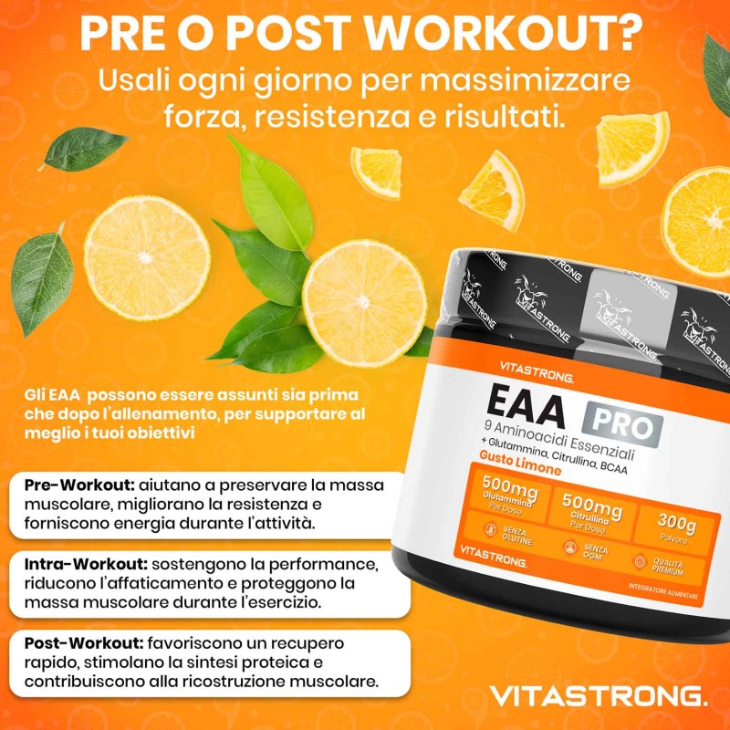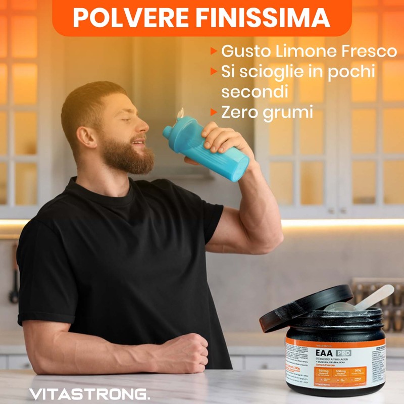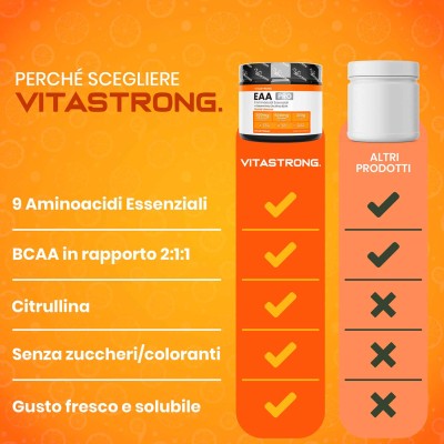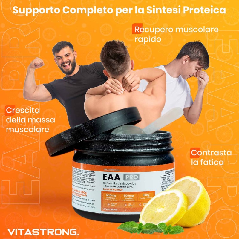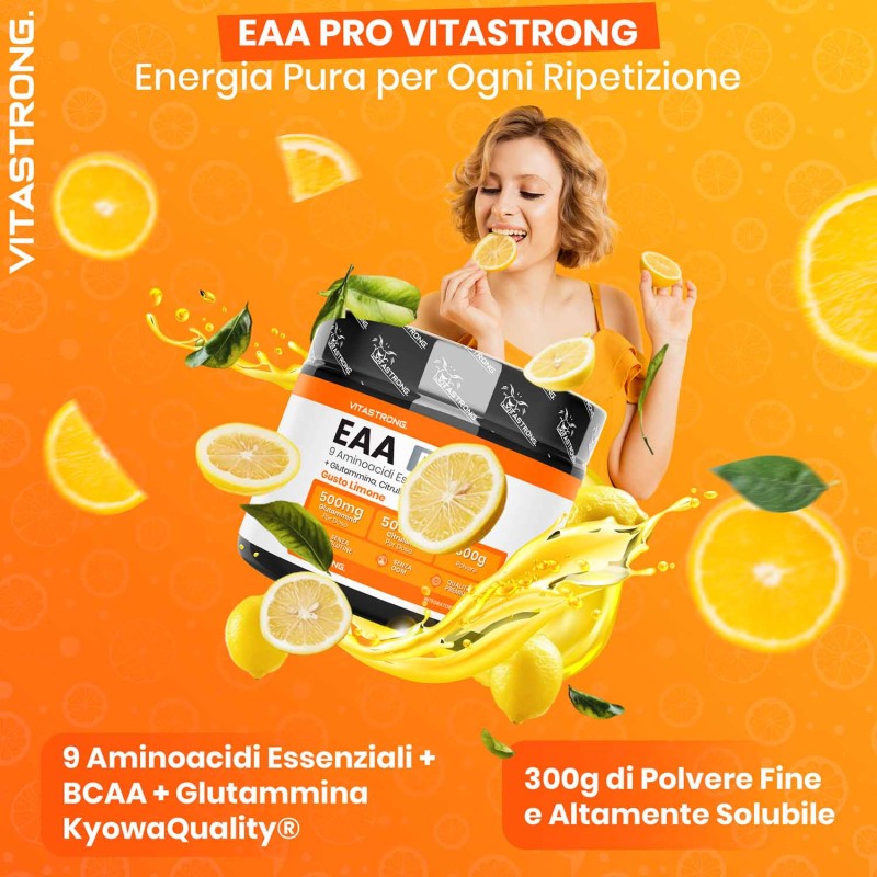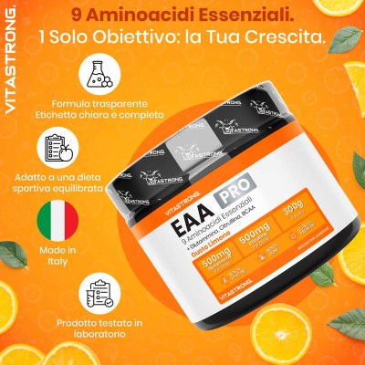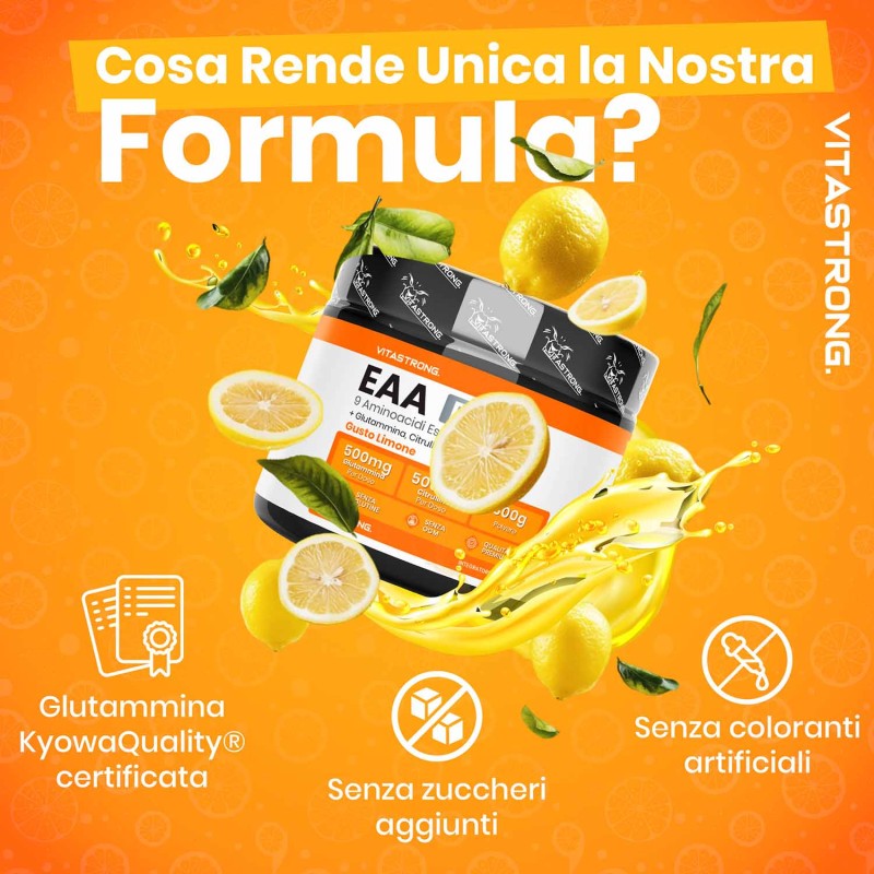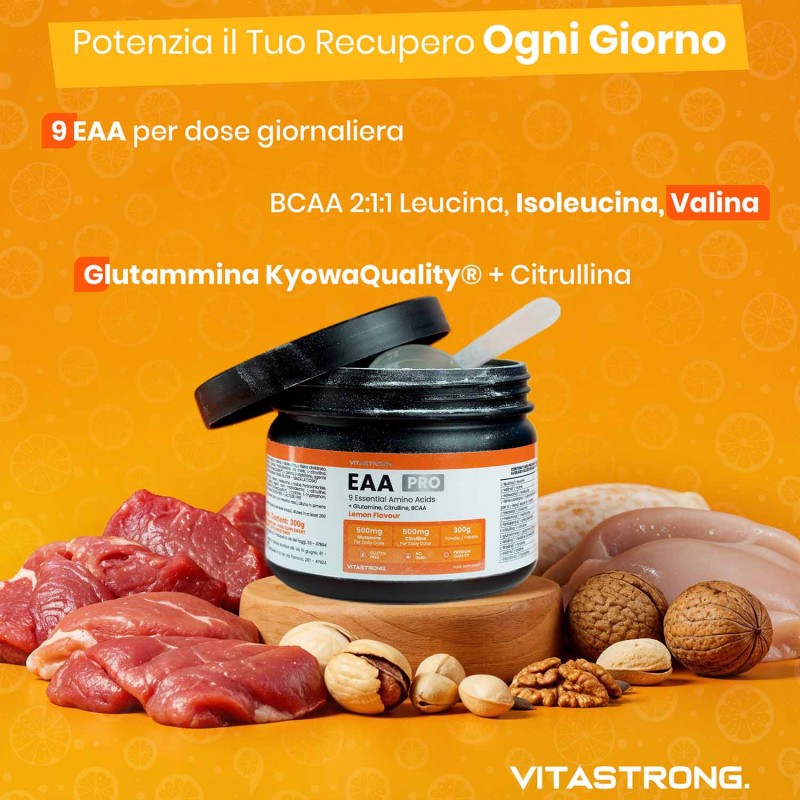 Gli EAA includono tutti i 9 aminoacidi essenziali necessari per la sintesi proteica, mentre i BCAA (valina, leucina e isoleucina) sono solo 3 e si concentrano sull’energia e sul recupero muscolare. Vitastrong EAA Pro li contiene entrambi per un’azione completa.