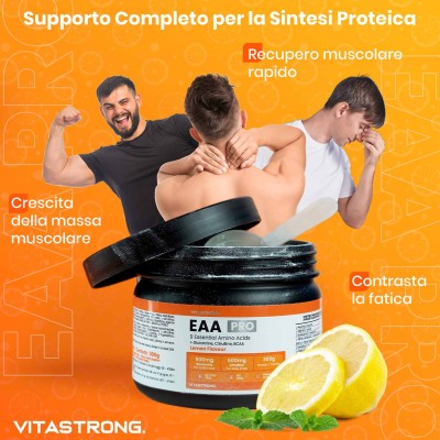 Vitastrong EAA Pro è un integratore avanzato di aminoacidi essenziali al gusto di Limone, Pesca o Frutti Rossi specificamente formulato per soddisfare il fabbisogno proteico/azotato con conseguenti effetti sul recupero muscolare, la crescita e le prestazioni fisiche. Gli aminoacidi essenziali (EAA) sono componenti fondamentali delle proteine e il nostro corpo non può produrli autonomamente, rendendone indispensabile l’assunzione tramite dieta o integrazione.