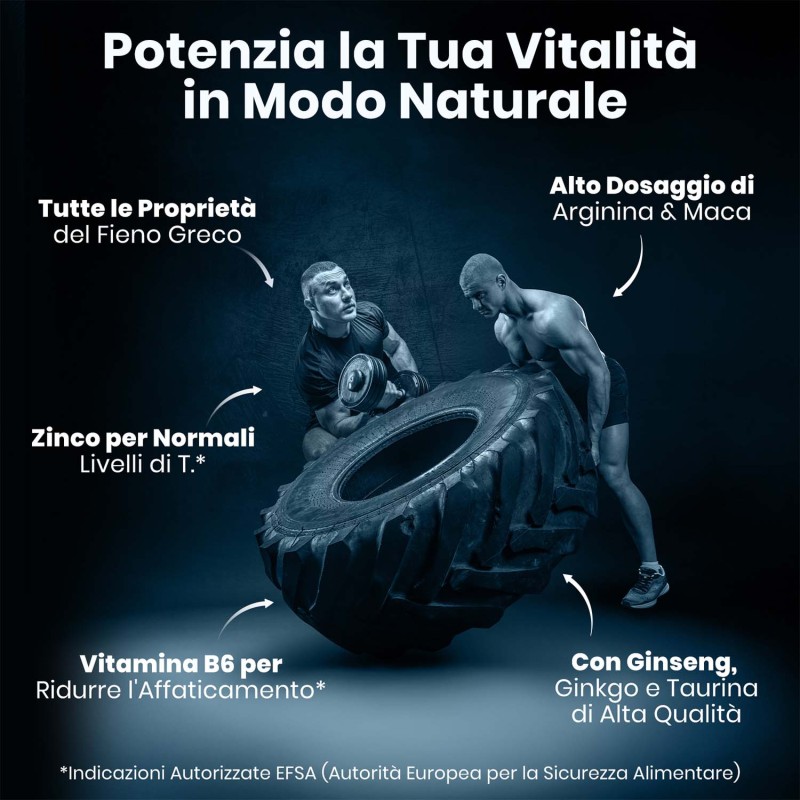 Ingredienti: L-Arginina base, maca andina (Lepidium meyenii Walp., radice) estratto secco tit. 0,5% in beta-ecdisone, involucro capsula (agente di rivestimento: idrossipropilmetilcellulosa, ossido di zinco); cordyceps (Cordyceps sinensis (Berk.) Sacc., corpo fruttifero fungino) estratto secco tit. 30% in polisaccaridi, fieno greco (Trigonella foenum-graecum L., seme) estratto secco tit. 50% in saponine totali, agenti antiagglomeranti: sali di magnesio degli acidi grassi, biossido di silicio; ginkgo biloba (Ginkgo biloba L., foglia) estratto secco tit. 24% ginkgo flavonoidi e 6% lattoni terpenici totali, ginseng (Panax ginseng C.A. Mey., radice) estratto secco tit. 12% in ginsenosidi, L-taurina, bisglicinato di zinco, cloridrato di piridossina (Vitamina B6).