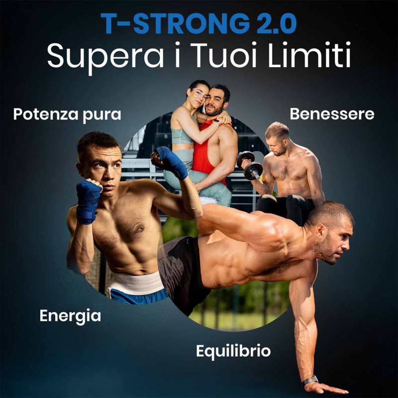 T-Strong 2.0 è un integratore avanzato pensato per chi desidera supportare la vitalità, l’energia e il benessere fisico. La sua formula combina ingredienti naturali con proprietà adattogene ed energizzanti, contribuendo al normale metabolismo ormonale e alla regolazione del testosterone.
