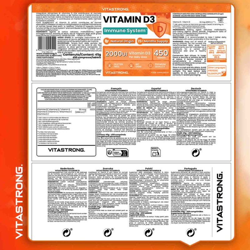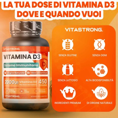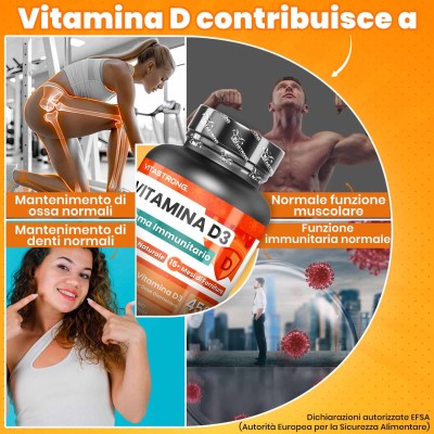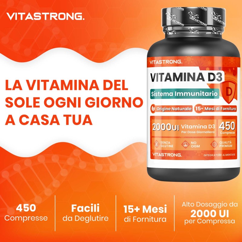 VITASTRONG Vitamin D3 è un integratore alimentare pensato per supportare il sistema immunitario, mantenere ossa e denti in salute e promuovere la normale funzione muscolare. Ogni compressa offre 2000 UI di Vitamina D3, garantendo il 100% del fabbisogno giornaliero.