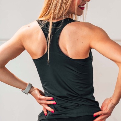 Il suo taglio olimpionico sul retro garantisce totale libertà a spalle e scapole, permettendoti di allenarti senza restrizioni.