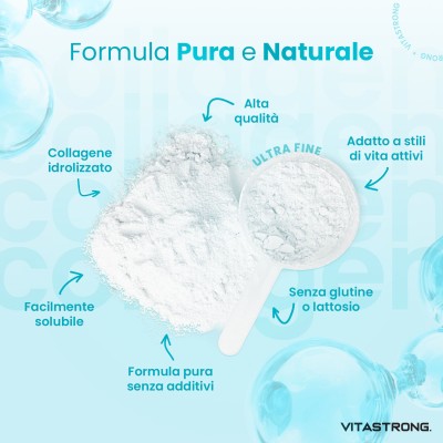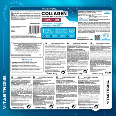 Il Collagene Idrolizzato 100% Puro di Vitastrong è un integratore in polvere composto da un solo ingrediente: collagene bovino idrolizzato COLLinstant®, altamente assimilabile e privo di glutine e lattosio.