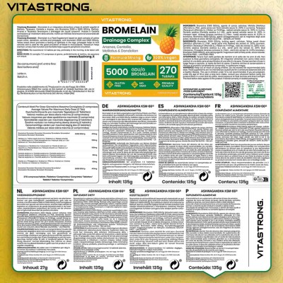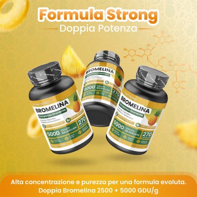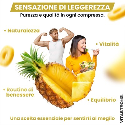 Ingredienti: Bromelina 2500 GDU/g, agente di carica: cellulosa; Meliloto (Melilotus officinalis (L.) Pall., parte aerea con fiore) estratto secco tit. 20% in cumarina; Tarassaco (Taraxacum officinale (L.) Weber ex F.H.Wigg., radice) estratto secco tit. 20% in inulina; Centella asiatica (Centella asiatica (L.) Urb., parte aerea) estratto secco tit. 20% in triterpeni totali; Ananas (Ananas comosus (L.) Merr., fusto) estratto secco tit. 0,3% in bromelina; Bromelina 5000 GDU/g; agenti antiagglomeranti: sali di magnesio degli acidi grassi, biossido di silicio. SENZA GLUTINE – SENZA LATTOSIO