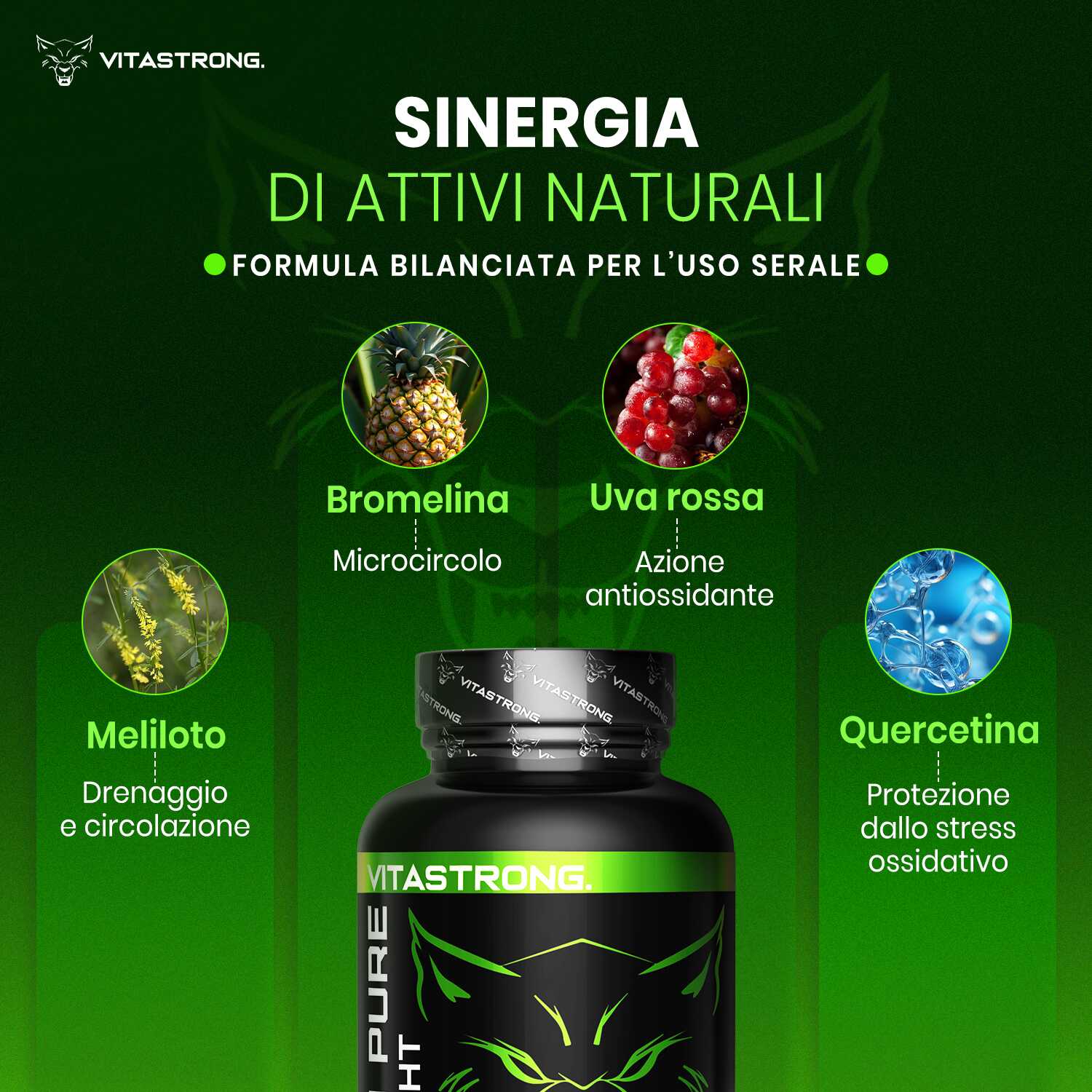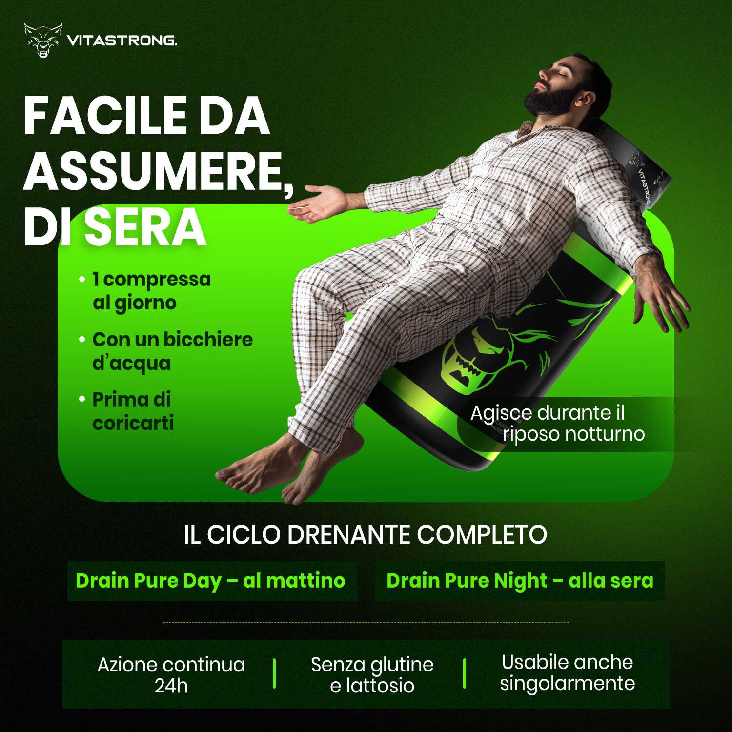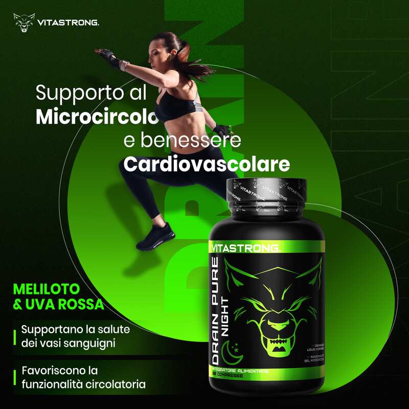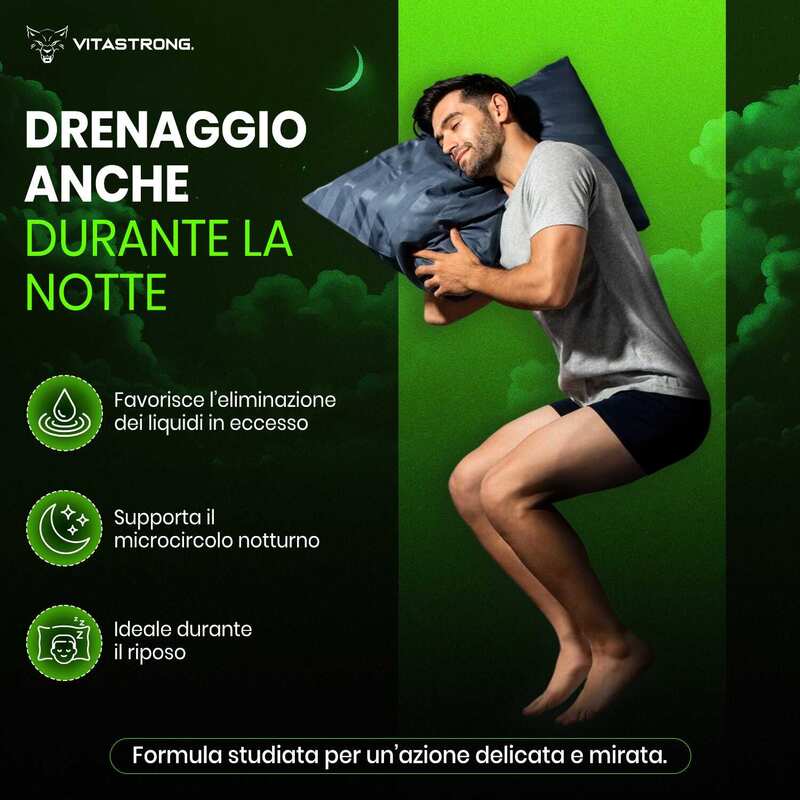 Il prodotto è stato formulato per lavorare in modo sinergico con Vitastrong Drain Pure, completando il ciclo di drenaggio e depurazione nelle ore notturne, tuttavia può essere usato anche singolarmente. È ideale per chi soffre di ritenzione idrica o desidera un supporto specifico per migliorare il microcircolo e sentirsi più leggero al risveglio.