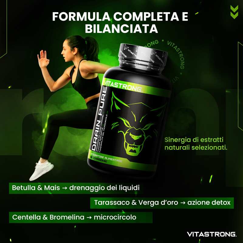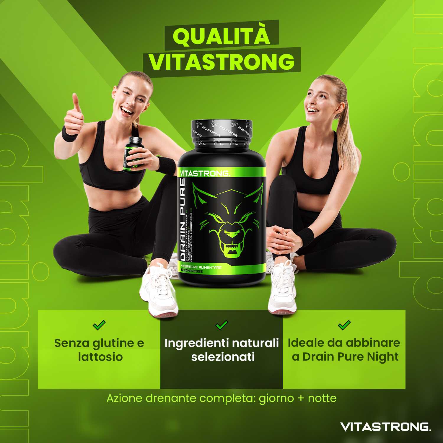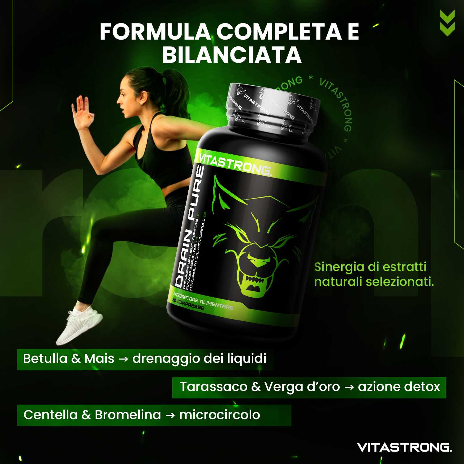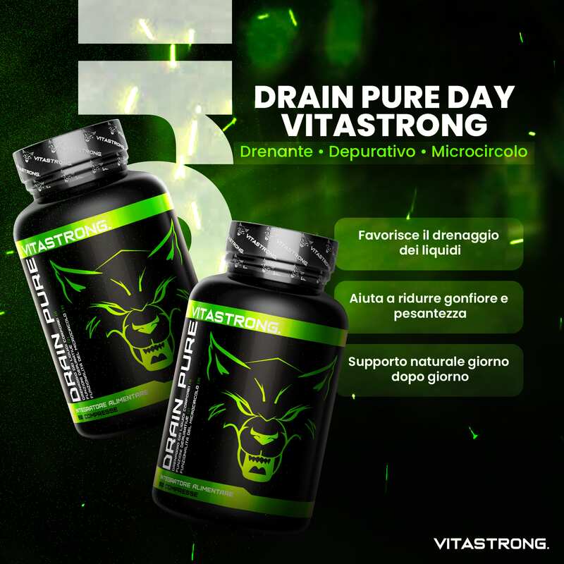 Vitastrong Drain Pure è un integratore naturale formulato per favorire il drenaggio dei liquidi corporei, stimolare le funzioni depurative e migliorare la funzionalità del microcircolo. Grazie alla combinazione di ingredienti selezionati come betulla, tarassaco, centella e bromelina, aiuta a ridurre la ritenzione idrica e contrastare la sensazione di pesantezza.