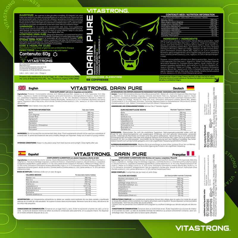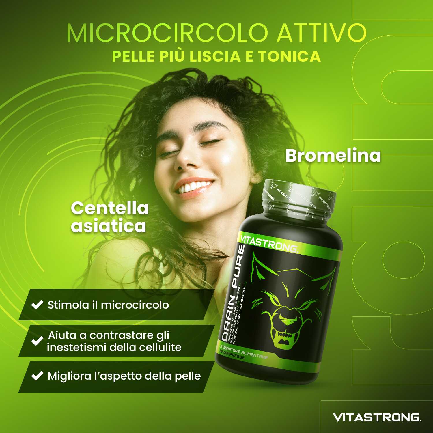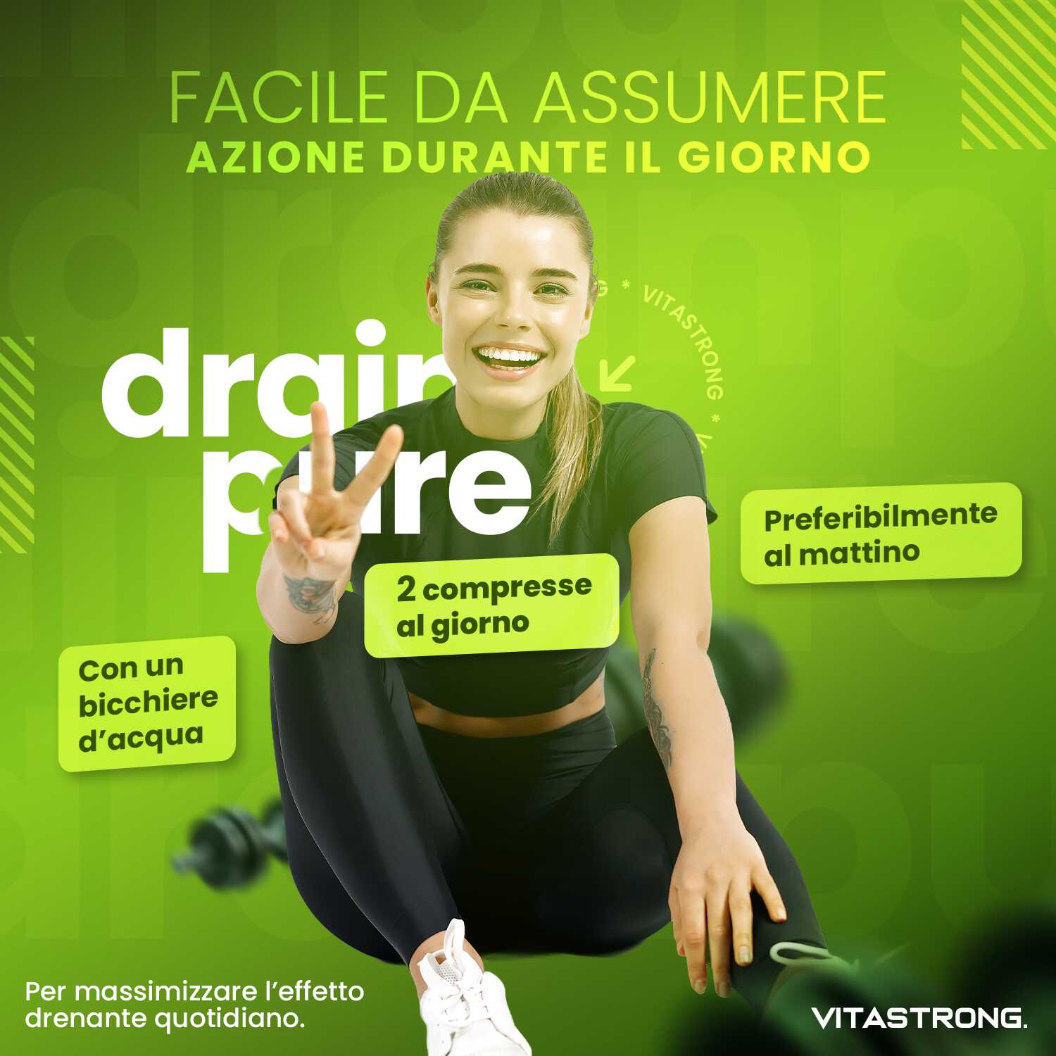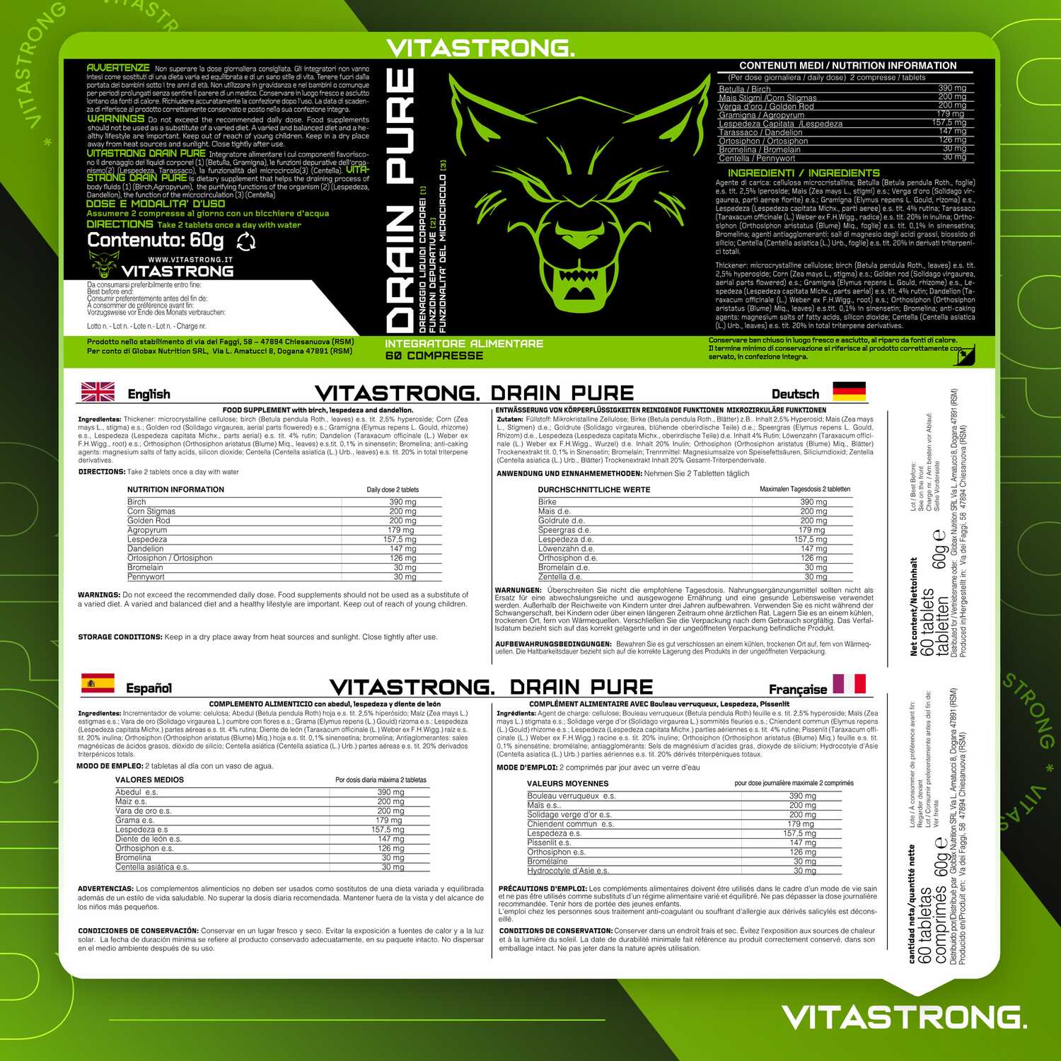 Vitastrong Drain Pure è un integratore naturale formulato per favorire il drenaggio dei liquidi corporei, stimolare le funzioni depurative e migliorare la funzionalità del microcircolo. Grazie alla combinazione di ingredienti selezionati come betulla, tarassaco, centella e bromelina, aiuta a ridurre la ritenzione idrica e contrastare la sensazione di pesantezza.