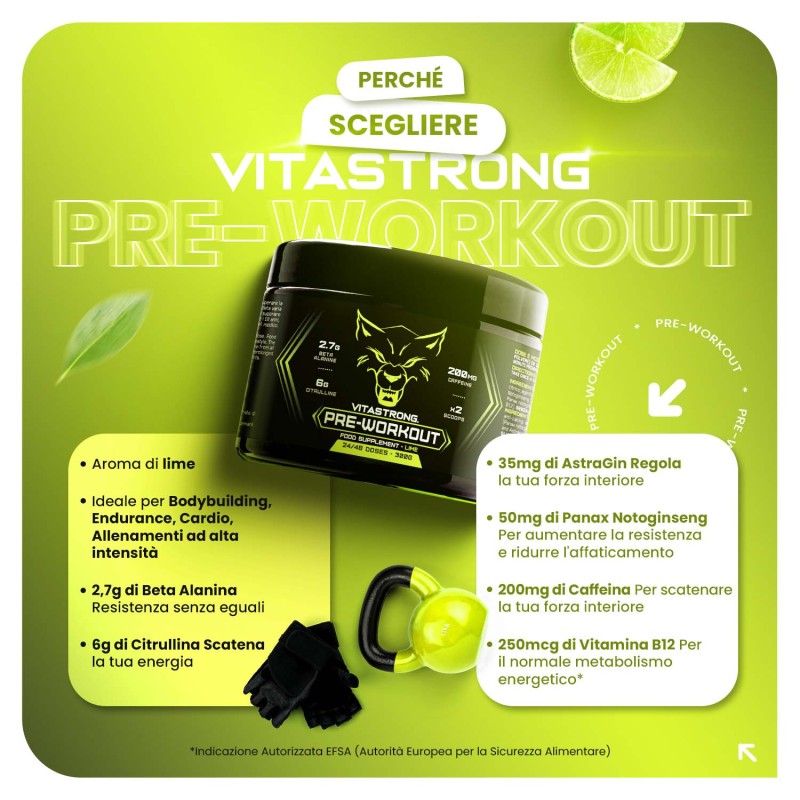 Il Preworkout di Vitastrong è il prodotto storico di Vitastrong, una formula potente progettata per trasformare ogni allenamento in una sfida vinta. Grazie alla combinazione di ingredienti chiave come L-citrullina, beta alanina, caffeina e AstraGin®, questo preworkout ti offre energia, resistenza e focus mentale senza paragoni.