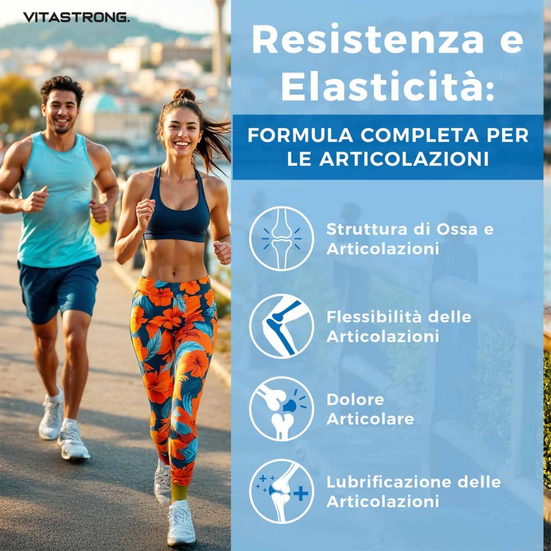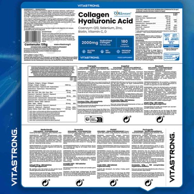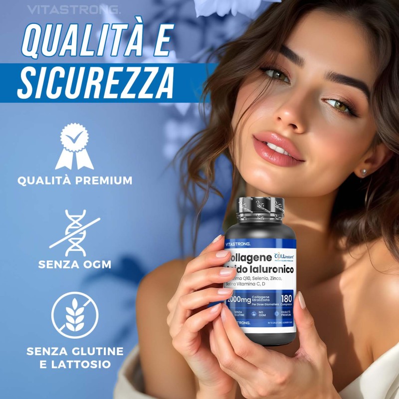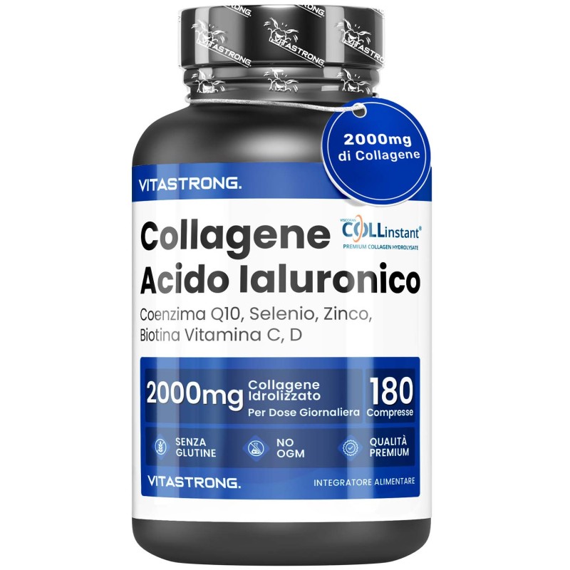 VITASTRONG Collagene & Acido Ialuronico è un integratore innovativo progettato per supportare la salute e la bellezza di pelle, capelli e unghie, oltre a migliorare l’elasticità della pelle e il benessere articolare. Grazie alla combinazione di collagene idrolizzato di alta qualità (COLLinstant®) e acido ialuronico, il prodotto agisce dall’interno per idratare e rigenerare i tessuti.
