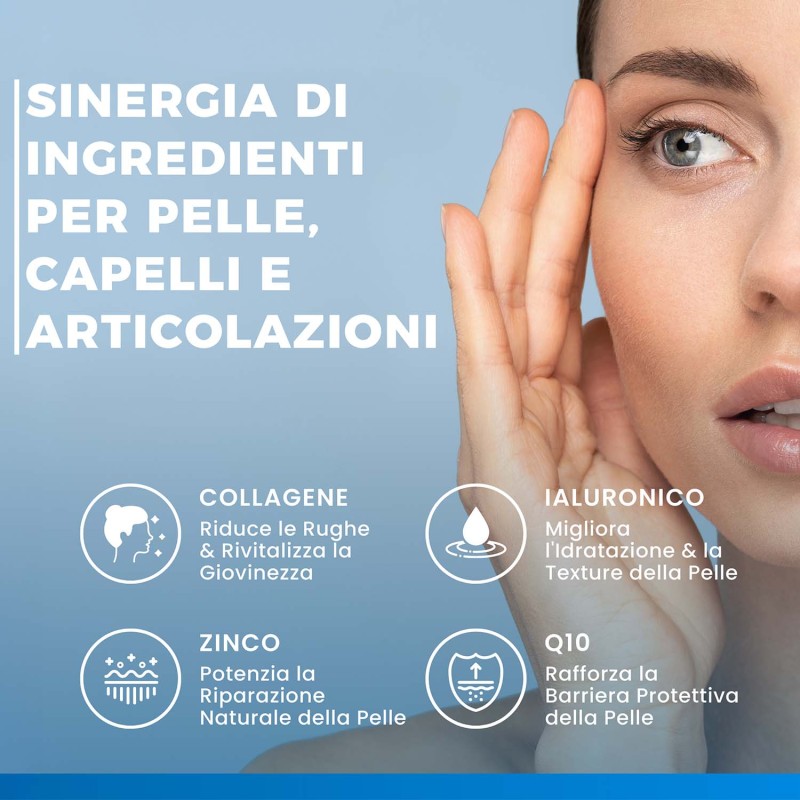 Questo prodotto non si limita a fornire 2000mg di collagene per dose giornaliera: offre una sinergia unica di nutrienti essenziali, tra cui vitamina C, biotina e coenzima Q10, per ottimizzare la produzione di collagene naturale e proteggere le cellule dallo stress ossidativo. Inoltre, la presenza di acido ialuronico garantisce un’azione idratante e rassodante sulla pelle, mentre zinco e selenio promuovono capelli e unghie sani.
