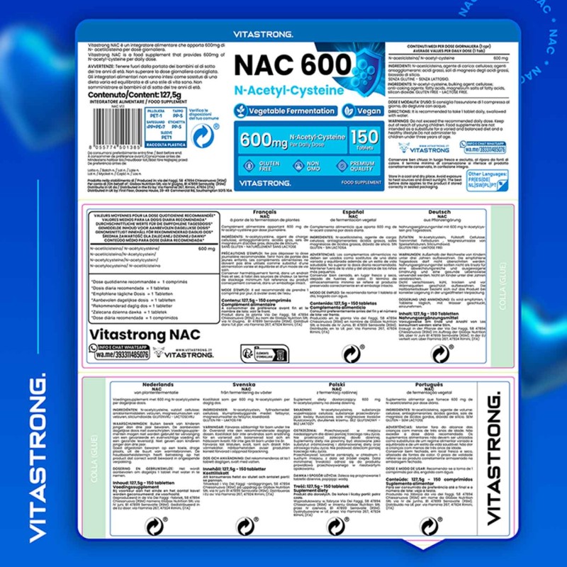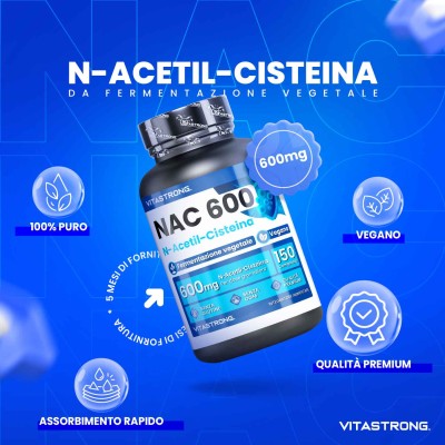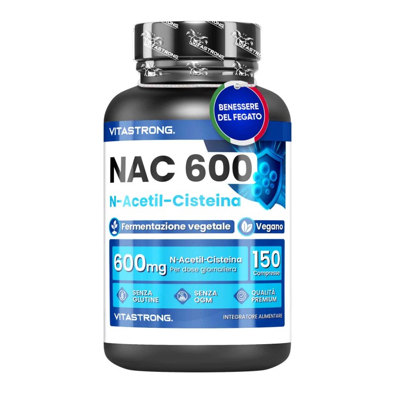 Vitastrong NAC rappresenta l'eccellenza nel campo degli integratori alimentari, progettato con un focus sulla purezza e l'efficacia. Ogni compressa apporta 600 mg di N-acetil-cisteina, un potente antiossidante che favorisce la sintesi del glutatione, ottimizzando la detossificazione del fegato e il sostegno immunitario (Free Radic Res. 2018 Jul;52(7):751-762). La nostra N-acetil-cisteina proviene da fermentazione vegetale, un metodo innovativo che assicura un profilo di purezza superiore, rispettando la fisiologia dell'atleta e l'ambiente.