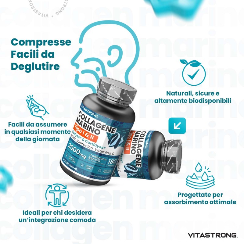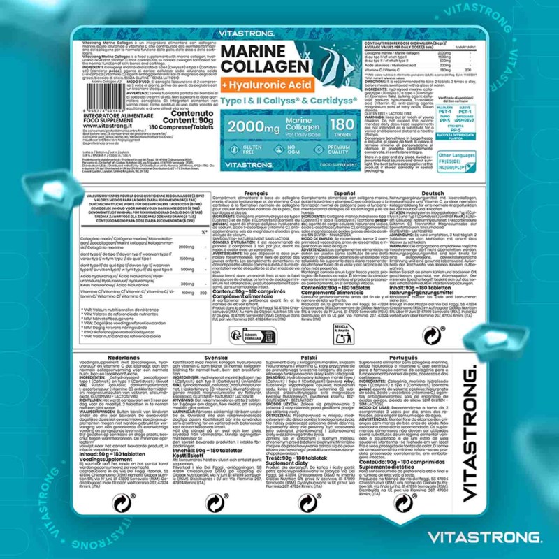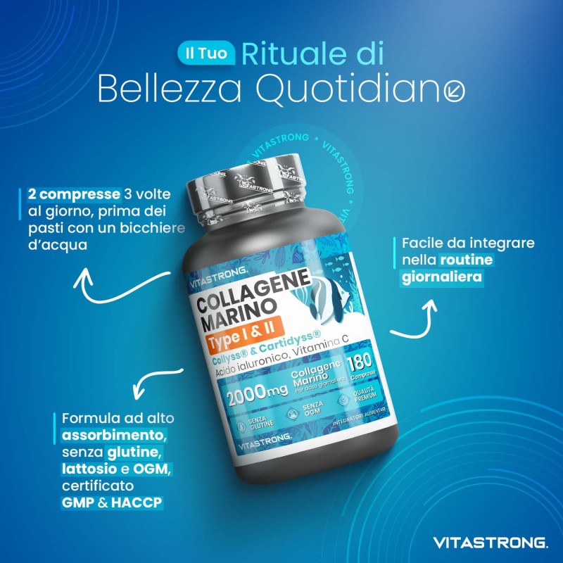 Il Collagene Marino di Vitastrong è un integratore premium con 2000 mg di collagene marino per dose, combinato con acido ialuronico e vitamina C per massimizzare i benefici. Formulato con materie prime certificate come Collys® e Cartidyss®, è pensato per supportare pelle, articolazioni e tessuti connettivi, garantendo un assorbimento ottimale e risultati visibili in breve tempo.