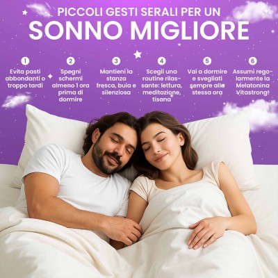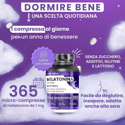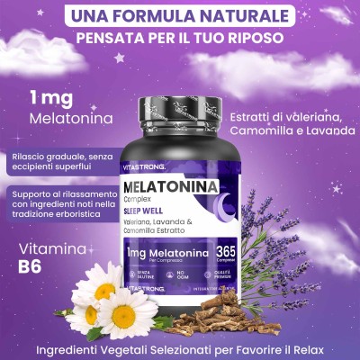 Vitastrong Melatonin Complex è un integratore progettato per favorire un sonno naturale e rigenerante, riducendo il tempo necessario per addormentarsi. La formula combina melatonina, una molecola prodotta naturalmente dal nostro organismo per regolare il ciclo sonno-veglia, con estratti naturali di valeriana, camomilla e lavanda, noti per le loro proprietà rilassanti.