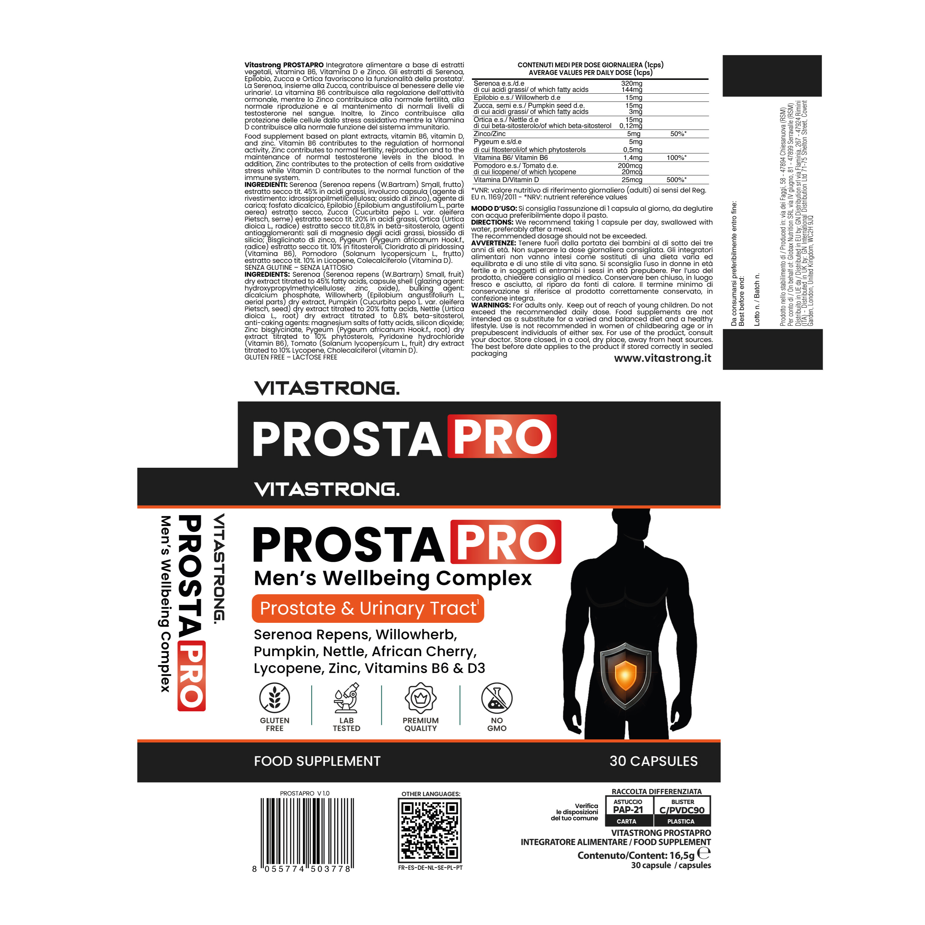 PROSTA PRO è un integratore avanzato studiato per il benessere maschile, formulato con estratti naturali titolati di Serenoa Repens, Epilobio, Semi di Zucca, Ortica, Pygeum e Licopene, in sinergia con zinco e vitamine B6 e D3.