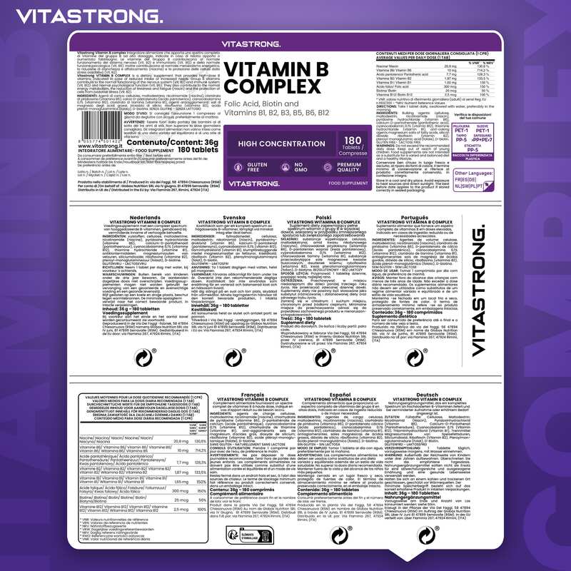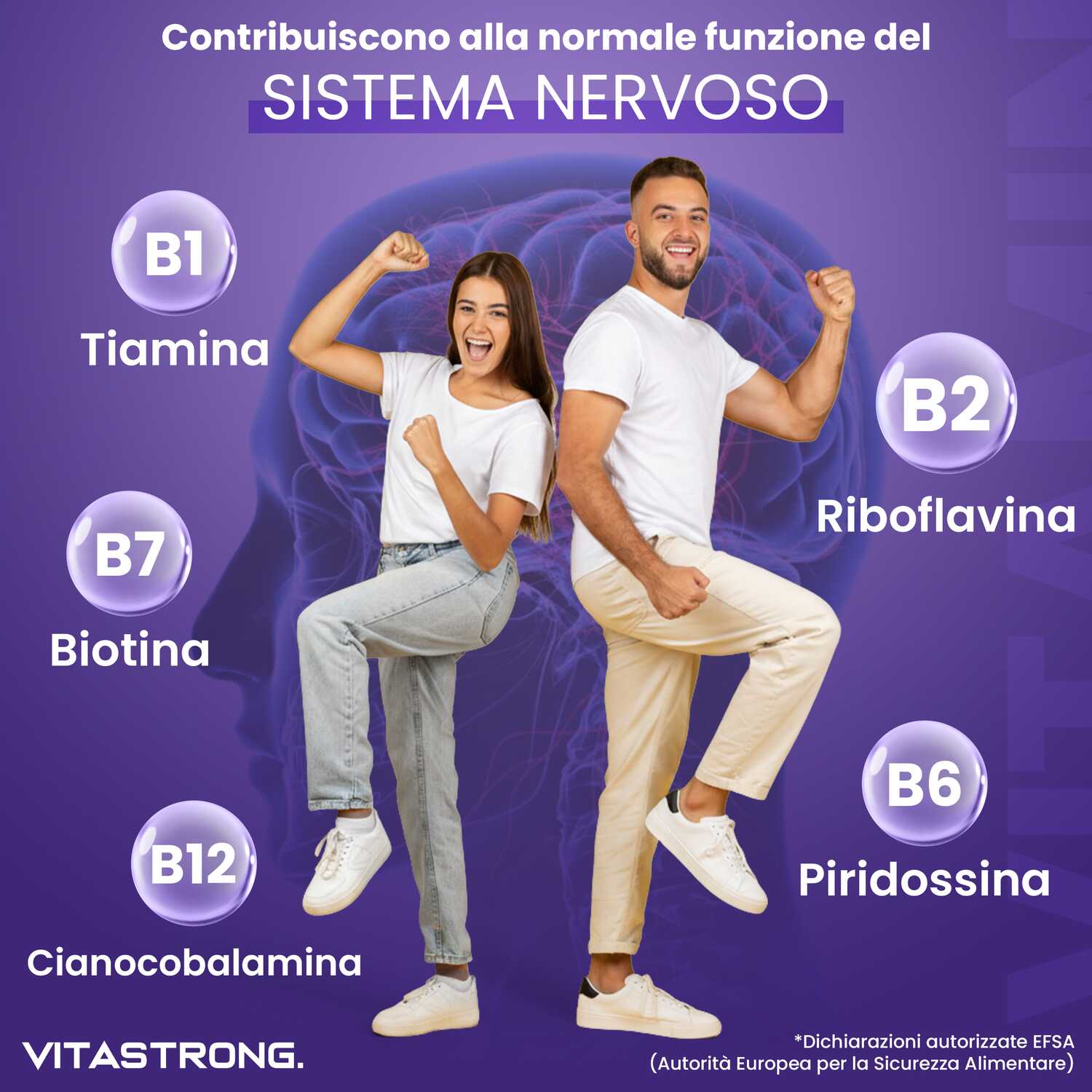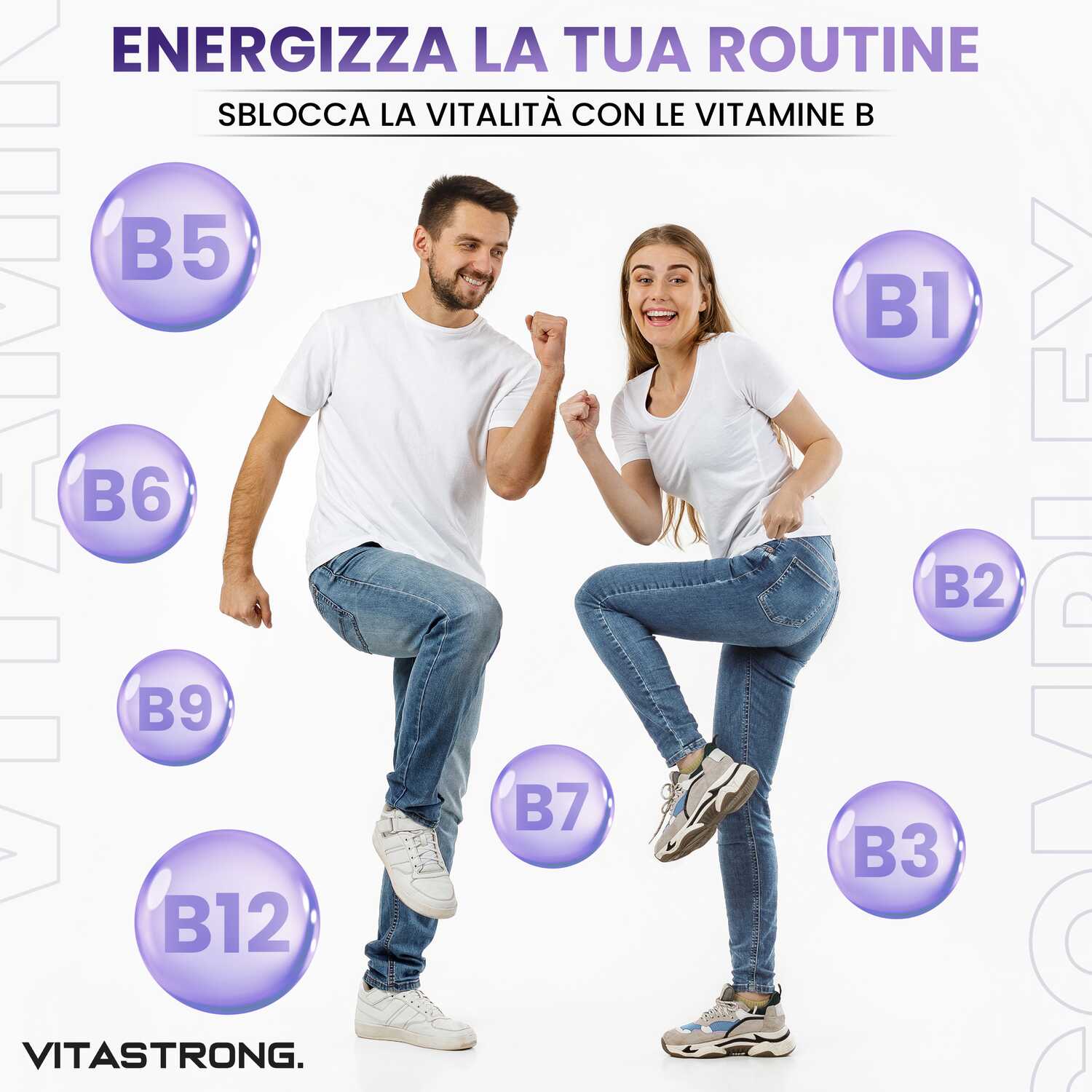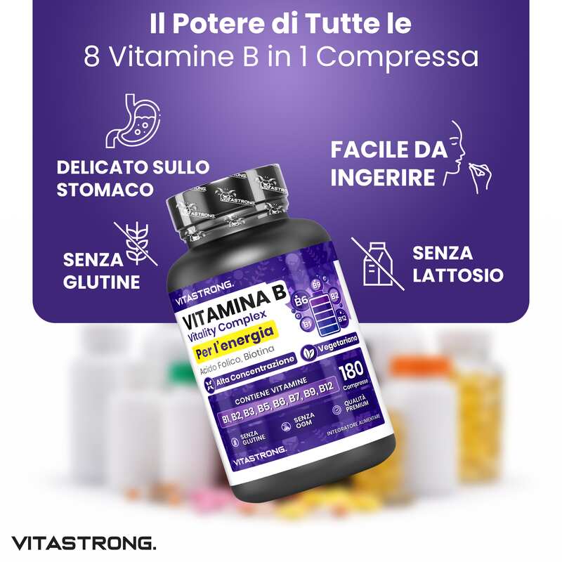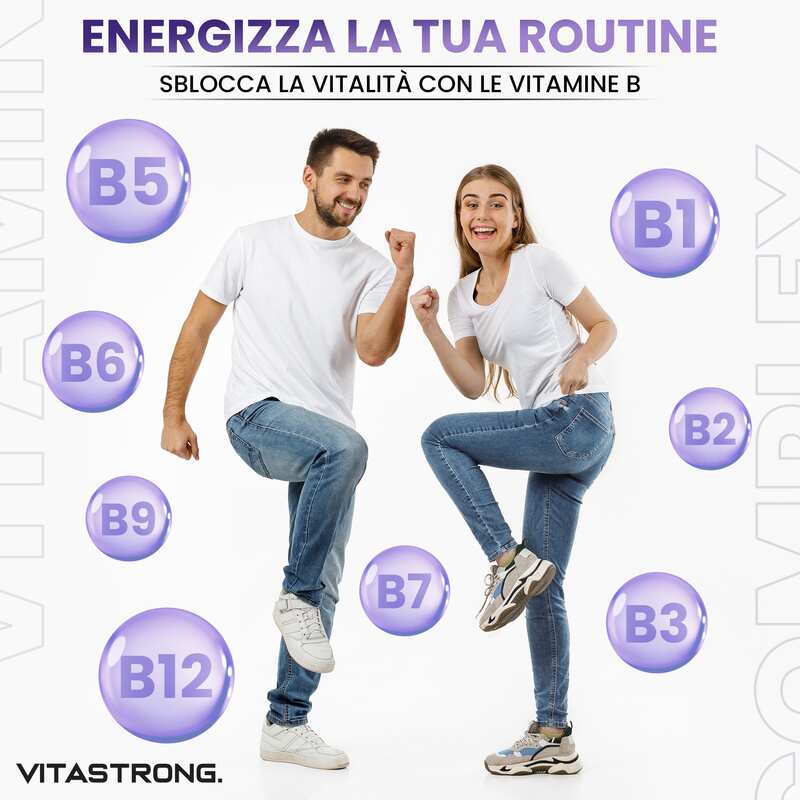 VITASTRONG VITAMIN B COMPLEX è un integratore alimentare completo che combina tutte le vitamine del gruppo B con biotina e acido folico, essenziali per sostenere energia, metabolismo, sistema nervoso e bellezza. Questo integratore è particolarmente indicato per chi desidera ridurre la stanchezza, mantenere capelli, unghie e pelle normali, e rafforzare il proprio benessere generale.