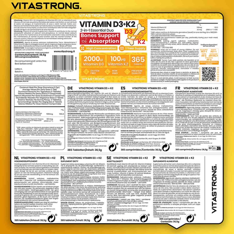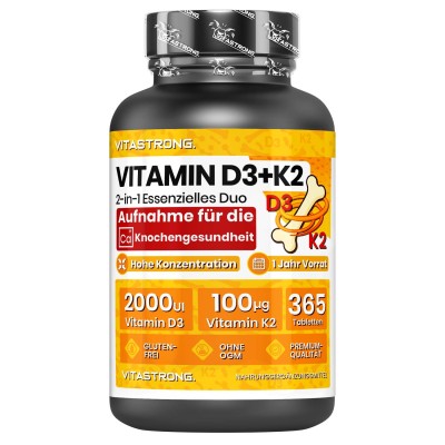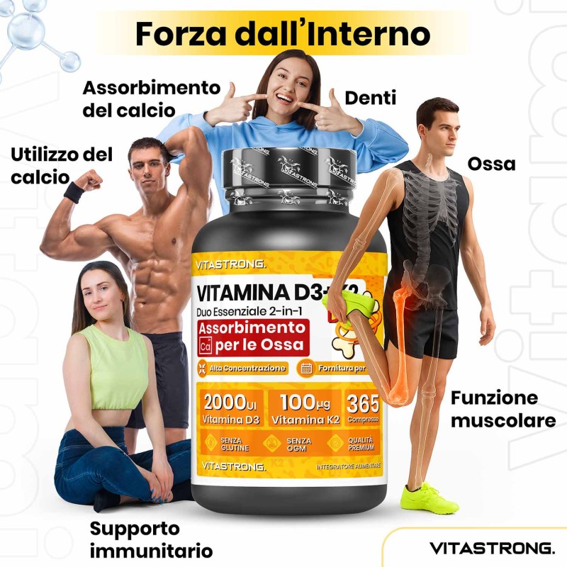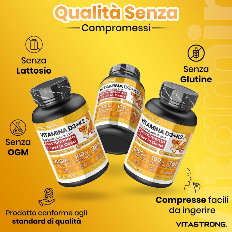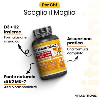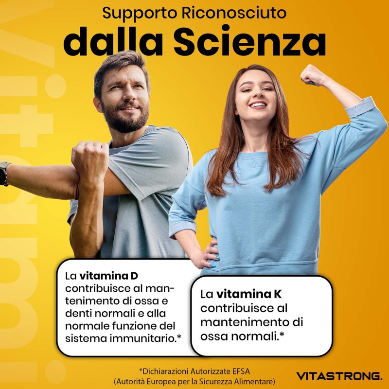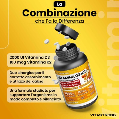 Vitastrong combina 2000 UI di Vitamina D3 con 100 μg di Vitamina K2 MK-7, il dosaggio ideale per favorire un assorbimento efficace del calcio, una migliore densità ossea e un sostegno completo al benessere generale.