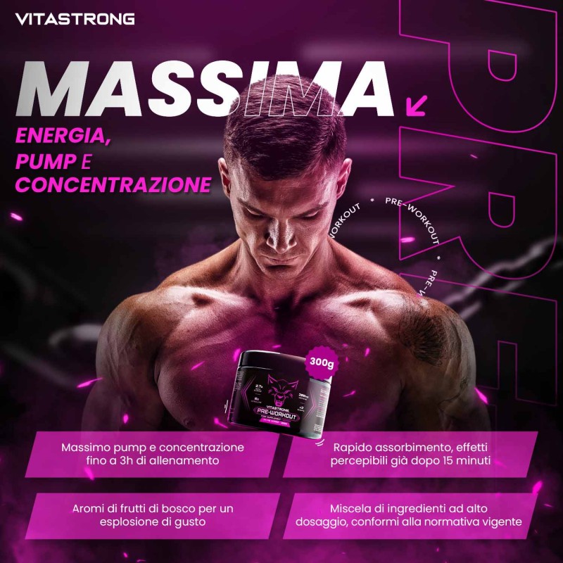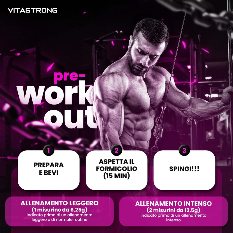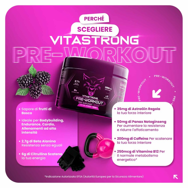 Il Preworkout di Vitastrong è il prodotto storico di Vitastrong, una formula potente progettata per trasformare ogni allenamento in una sfida vinta. Grazie alla combinazione di ingredienti chiave come L-citrullina, beta alanina, caffeina e AstraGin®, questo preworkout ti offre energia, resistenza e focus mentale senza paragoni.