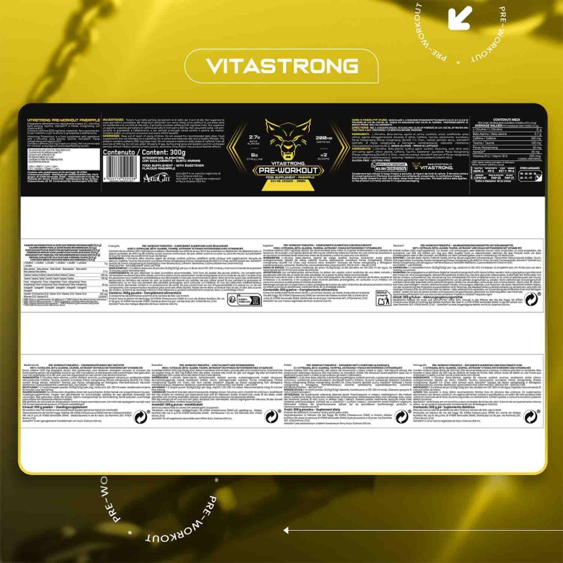 Ingredienti: L-Citrullina, Beta-alanina, agente di carica: sorbitolo; acidificante: acido citrico; agente antiagglomerante: biossido di silicio; caffeina, edulcoranti: sucralosio, acesulfame K; Taurina, regolatore di acidità: citrati di potassio; Panax Notoginseng (Panax notoginseng (Burkill) F.H. Chen., radice) estratto secco, aroma, AstraGin® (estratto di Panax notoginseng e Astragalus membranaceus), colorante: riboflavina; Cianocobalamina (vitamina B12).